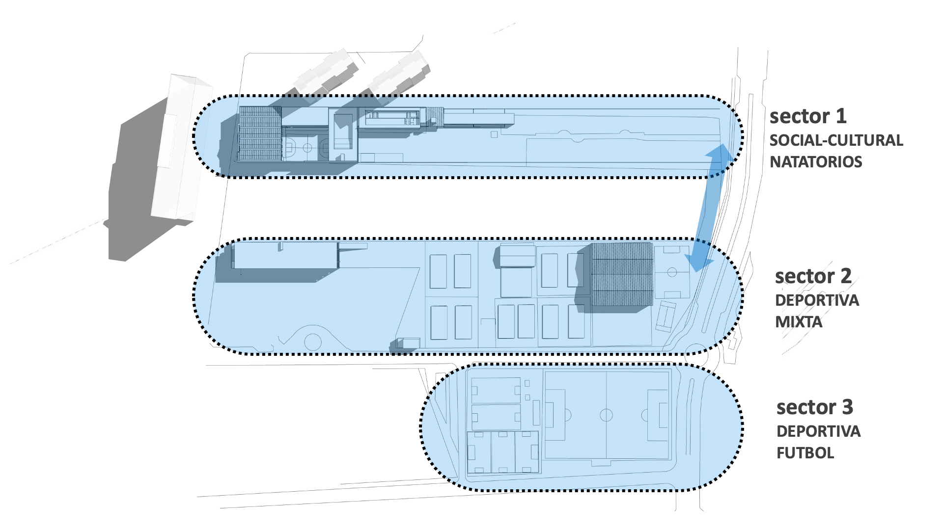 Visión del desarrollo futuro de la Sede Social, Cultural y Deportiva, Campo Covadonga, del Centro Asturiano de Buenos Aires, ubicado en Vicente López, Provincia de Buenos Aires, contemplando la localización de las diferentes zonas a redefinir e incorporando nuevos vínculos entre las zonas sociales, culturales y deportivas, con el fin de integrar los diferentes sectores y potenciar la calidad de la actividad de su comunidad asociada.