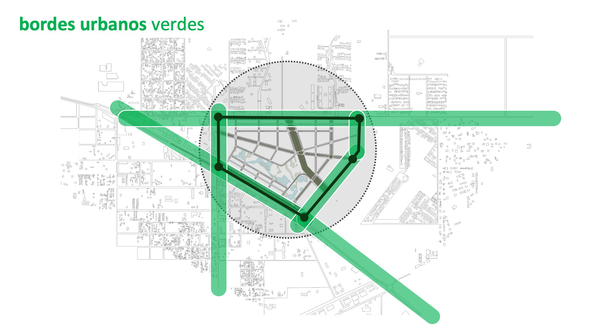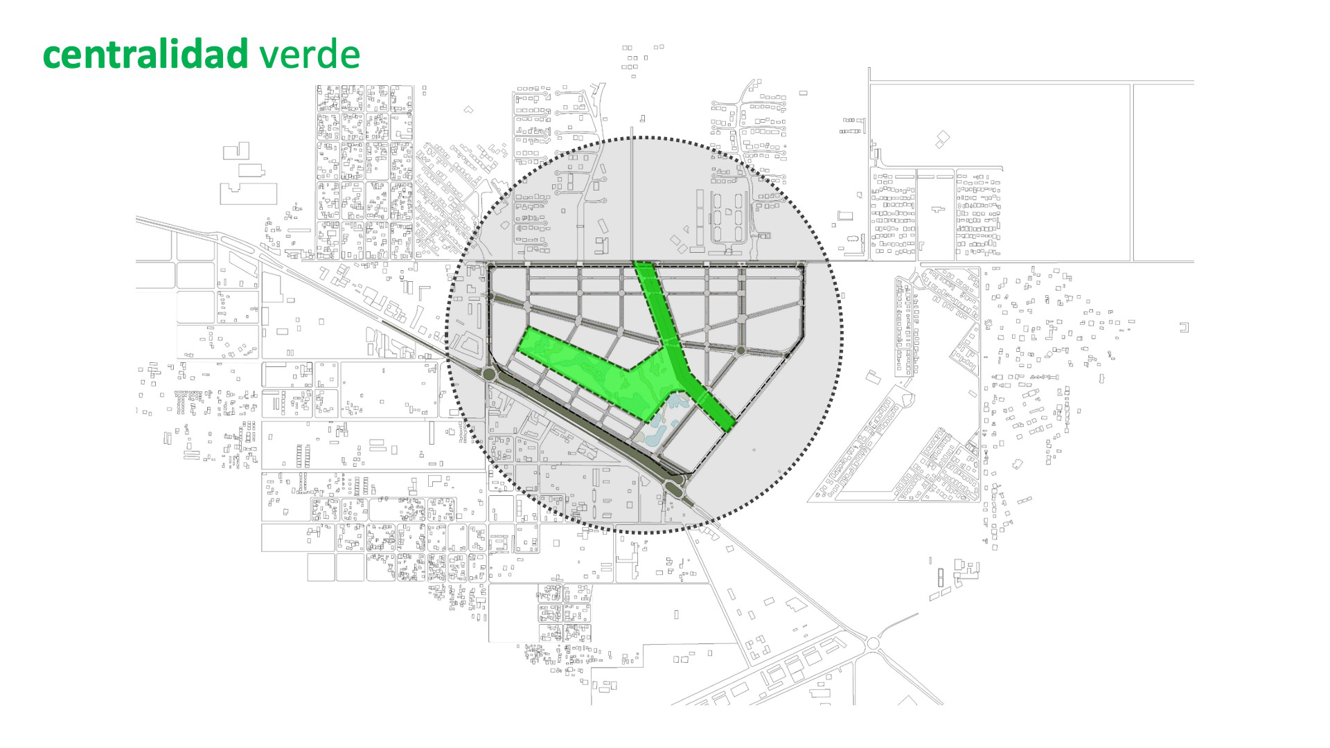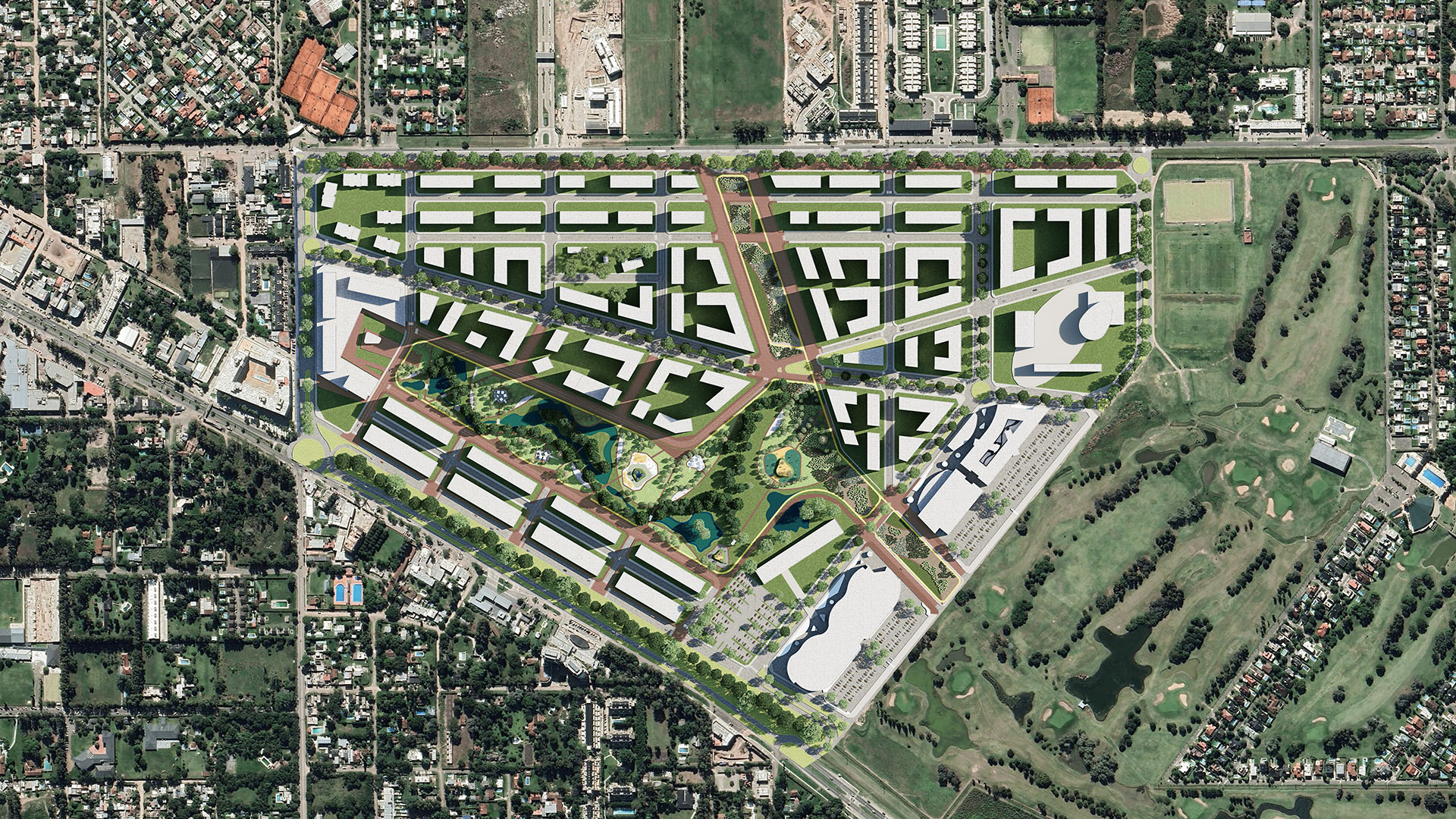 La visión diferencial de la propuesta en desarrollo en la localidad de Canning, una zona creada en base a la continua construcción de barrios privados cerrados, se fundamenta en un aporte original, el proyecto de un barrio abierto de más de 30 Ha atento al futuro de la ciudad, con diversas tipologías residenciales y usos mixtos dedicados a comercios y equipamientos con un parque urbano central de 11 Ha. Así, la propuesta de OFICINA URBANA de intercalar en el tejido condominios multifamiliares ajardinados localizados junto a comercios y múltiples servicios comunitarios, en el contexto de un gran parque público abierto a la socialización, genera mucha más semejanza a los barrios metropolitanos que a los barrios o centros comerciales aislados de los suburbios urbanizados. El proyecto producido en Canning promueve la idea de consolidar el tejido de la ciudad como arena de intercambio, mixtura, convivialidad y diversidad, alentando la confluencia de dos corrientes de intensidades distintas: una centralidad residencial suburbana y un parque con equipamiento comercial e institucional de escala metropolitana.
