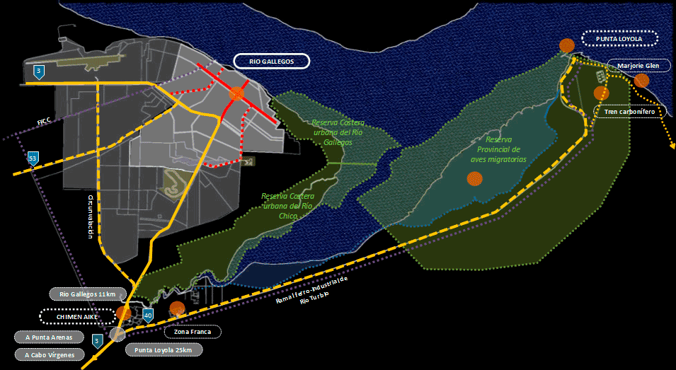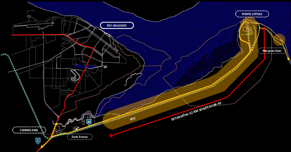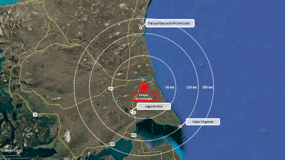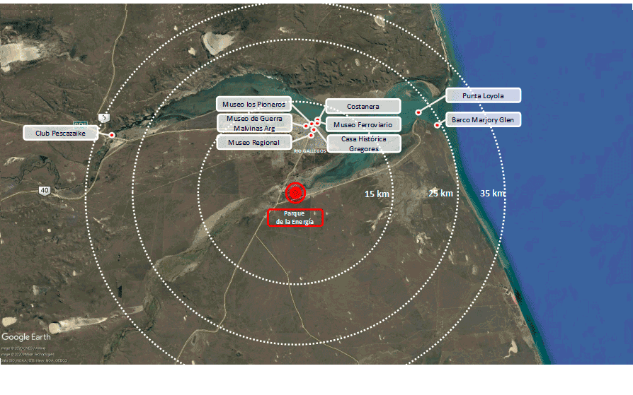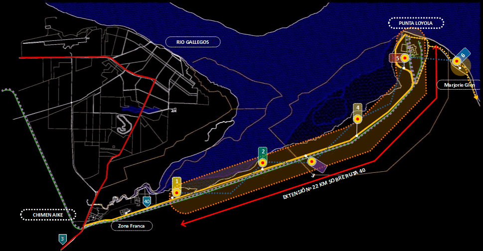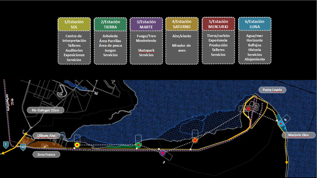 Allí y ante esa marca y fortaleza simbólica de la tierra, el agua y el viento y a lo largo de la RN 40 entre la intersección con la RN3 y con destino a Punta Loyola y en tan notable espacio geográfico, natural e histórico cultural, planteamos desarrollar un trascendente y nuevo espacio para la comunidad local y visitante, El Parque de la Energía de Santa Cruz, sobre un área de intervención de superficie diversa y a lo largo de 25km de extensión.