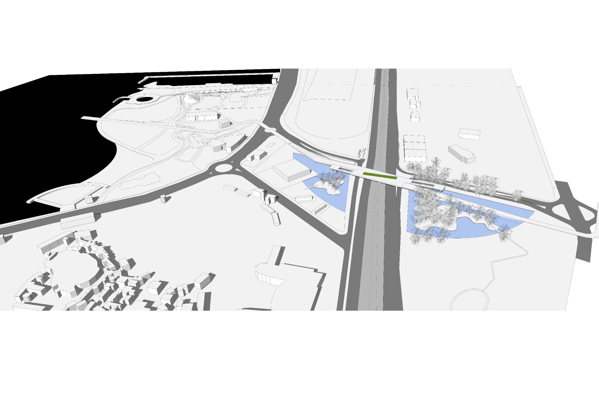 Así la propuesta desarrolla un paseo ciudadano extenso y contínuo, que inicia su trayecto por la calle Pampa desde el Parque de Barrancas de Belgrano, el cual al atravesar bajo las vías en altura de ramal Mitre, avanza con un corredor verde peatonal y de bicisenda hasta un puente diseñado a modo de un gran mirador en altura sobre las vías de la autovía, del ferrocarril y el túnel vehicular, integrado a la variada naturaleza existente junto a un paisaje de nuevas lagunas.