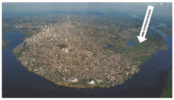 Plan de radicación de 4000 viviendas sociales. Desarrollo de un proyecto urbano para la radicación de un área de viviendas en la zona ribereña de la ciudad de Asunción. El proyecto, colabora en dar solución a las condiciones de dificultad de miles de habitantes situados en zonas inundables, determinando diferentes intervenciones a escala metropolitana, local y barrial, recomponiendo la Franja Costera de Asunción, en el bañado sur y el mejoramiento integral del área.