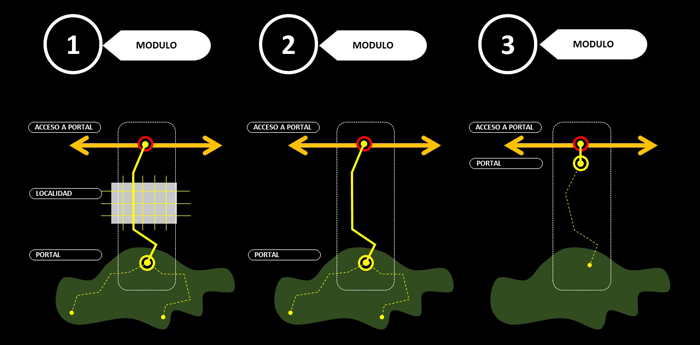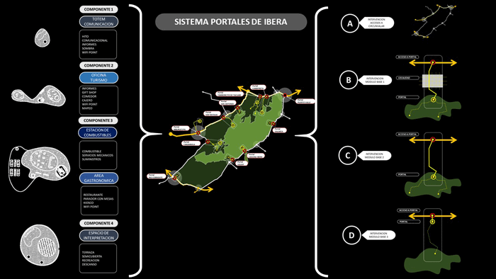 La propuesta refiere al diseño de la zona de acceso previo a cada uno de los Portales del Iberá, produciendo de ese modo un espacio de acogida a los visitantes, en donde atender a su movilidad, disponer de un centro de interpretación sobre los sitios de interés, observar la exposición de datos y mapeos y dar una atención integral al viajero, todo ello producido en diferentes secuencias, a lo largo de tan extenso circuito de esta virtuosa geografía de la Provincia de Corrientes.