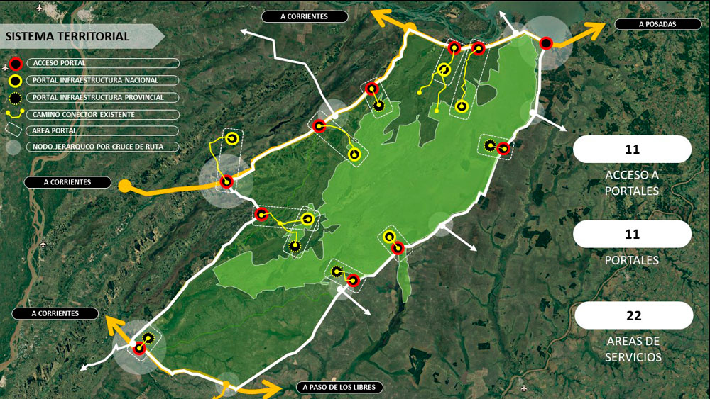 En ese marco colaborativo, la propuesta aquí presentada, se basa en la planificación y el diseño de la RUTA ESCÉNICA DEL IBERÁ, generando para ello un sistema de recorridos y accesos especializados, conformando una zona previa a cada uno de los Portales del Parque, produciendo de ese modo un espacio de acogida a los visitantes, en donde atender a su movilidad, ser informado sobre los sitios de interés, observar la exposición de datos y mapeos y dar una atención integral al viajero, todo ello producido en diferentes secuencias, a lo largo de tan extenso circuito de esta virtuosa geografía de la Provincia de Corrientes.